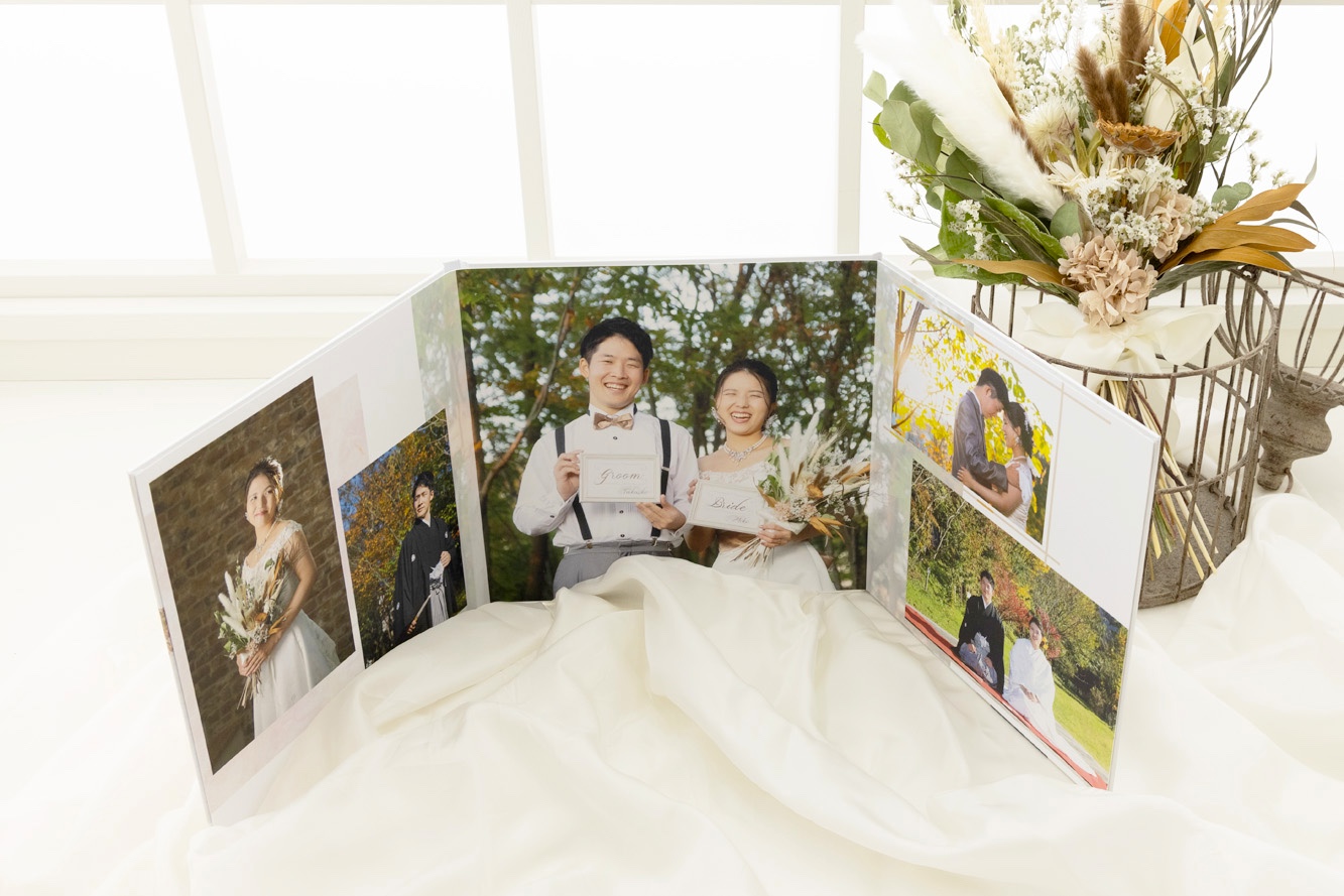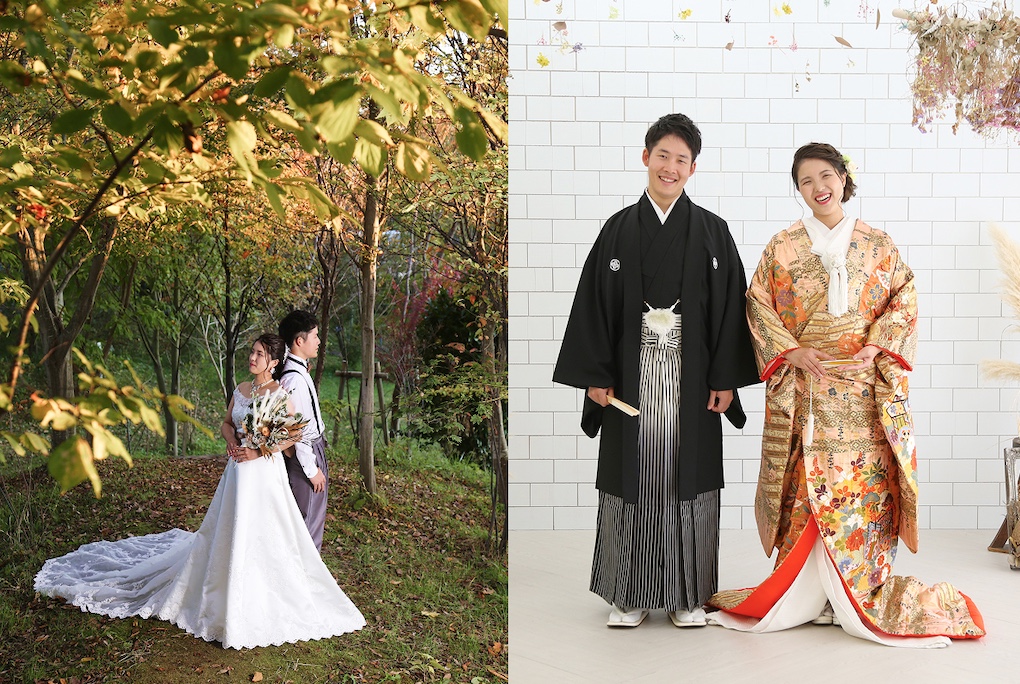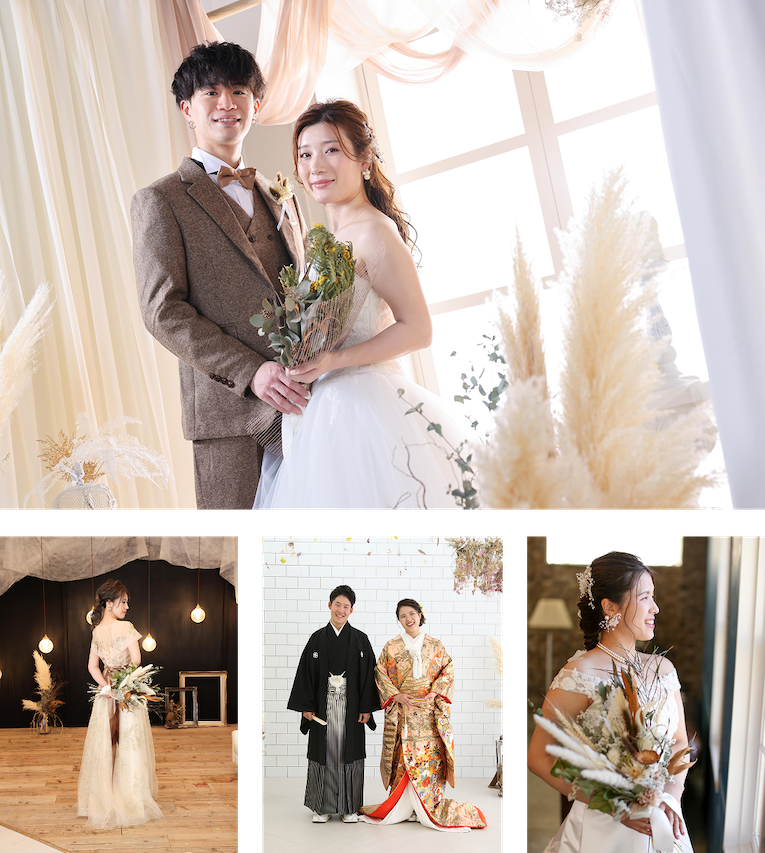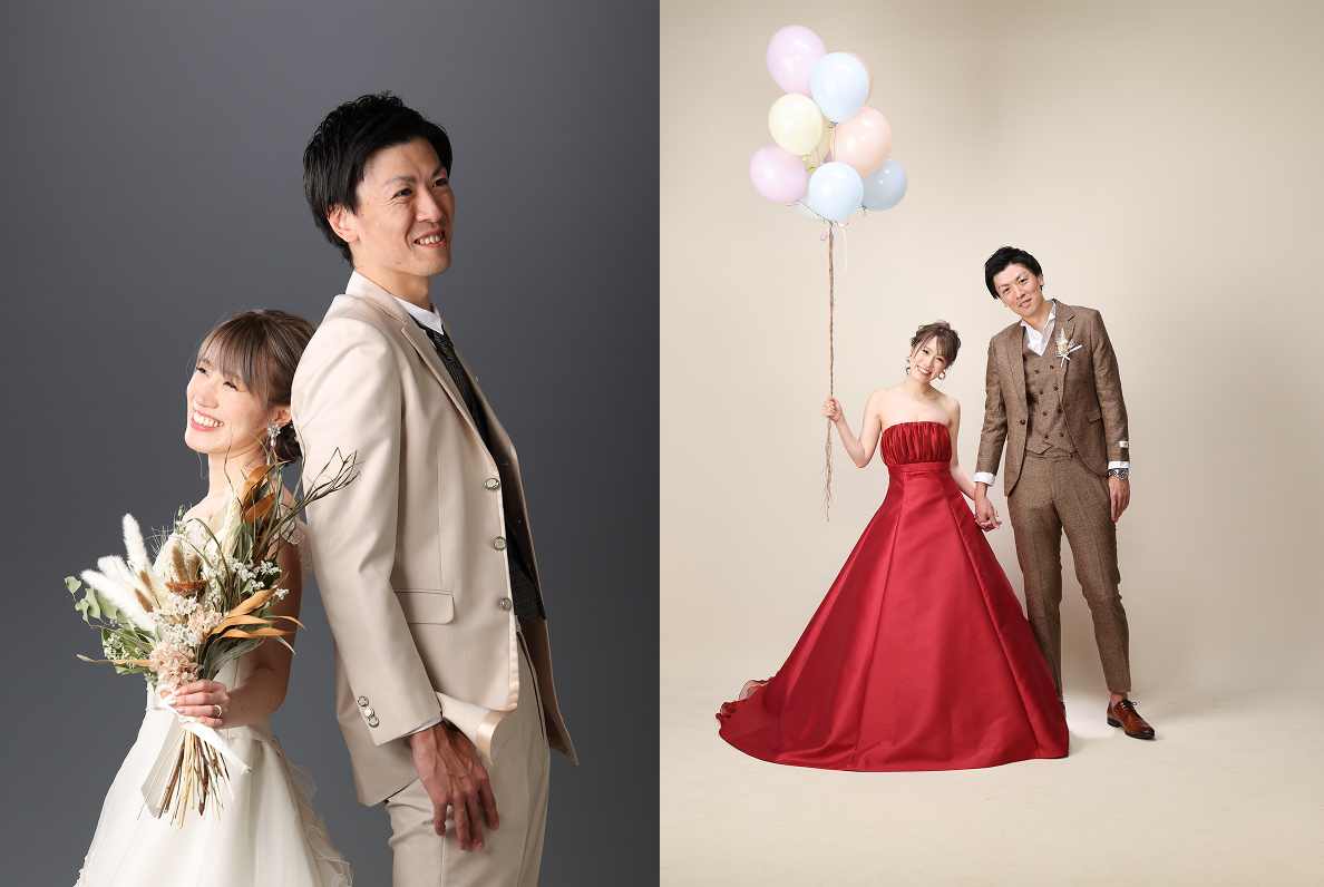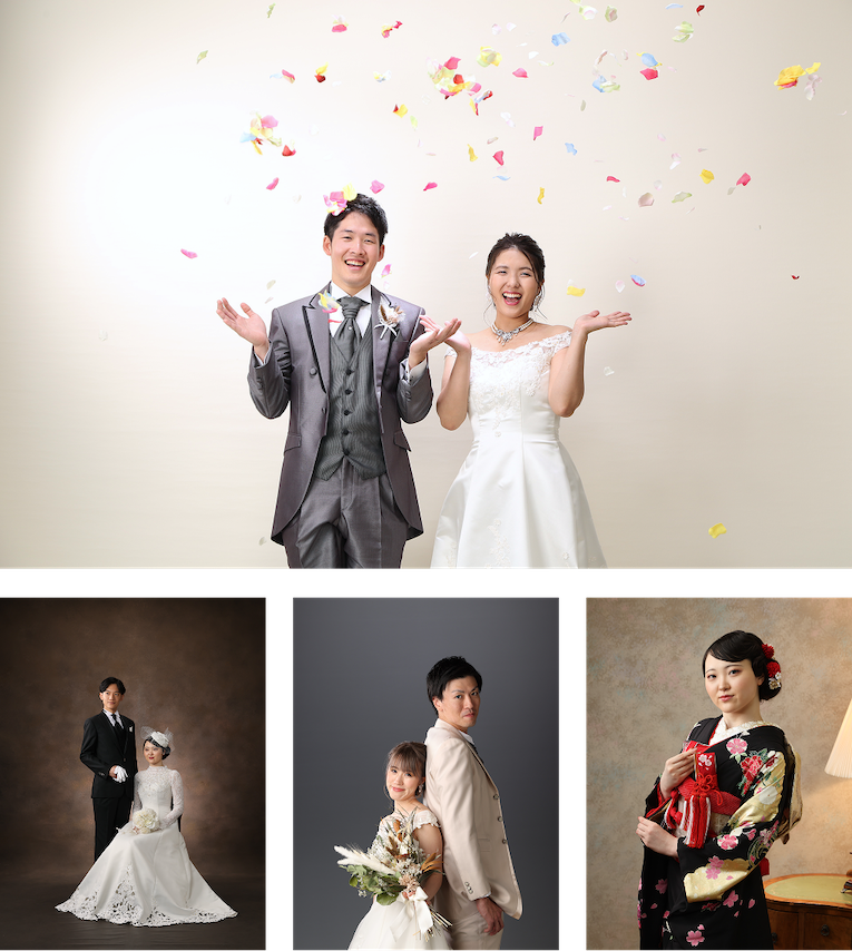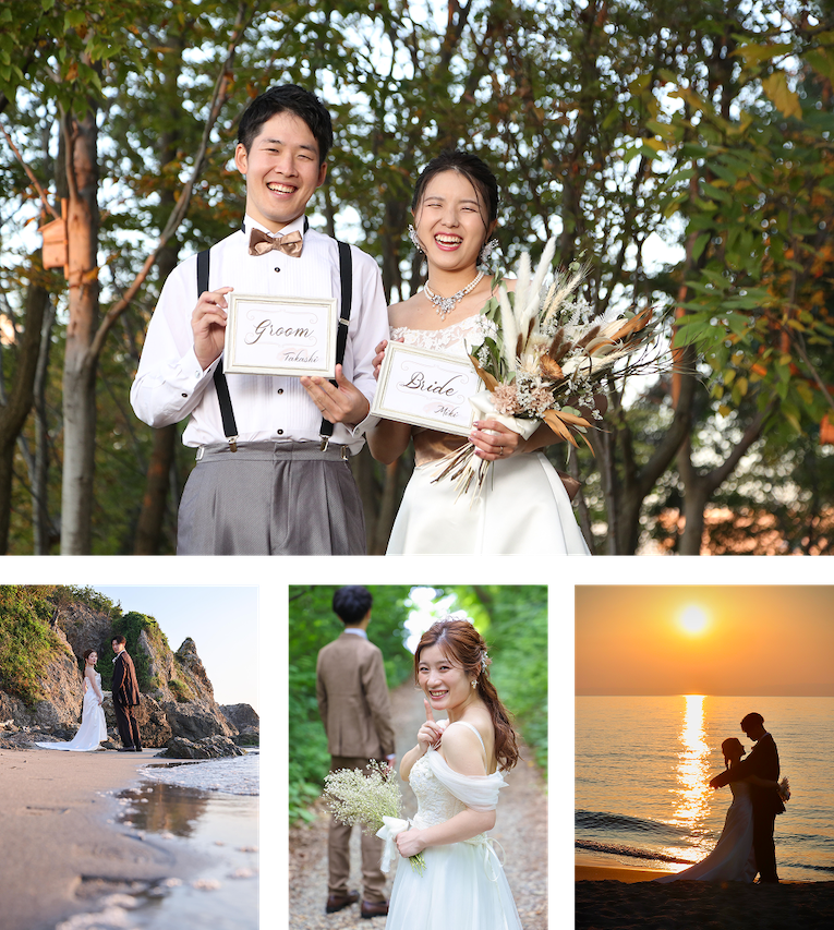 スクリーンで撮影する美しく伝統的な結婚写真はもちろん、自然豊かな海や山、思い出の場所でのロケーション撮影や、大好きなペット、車やバイク、趣味や推しグッズと一緒に撮りたいなど、おふたりらしい世界観を自由に表現して撮影します。幸せな人生のはじまりの一枚をクオリティの高い写真と映像で表現し、感動をお届けいたします。